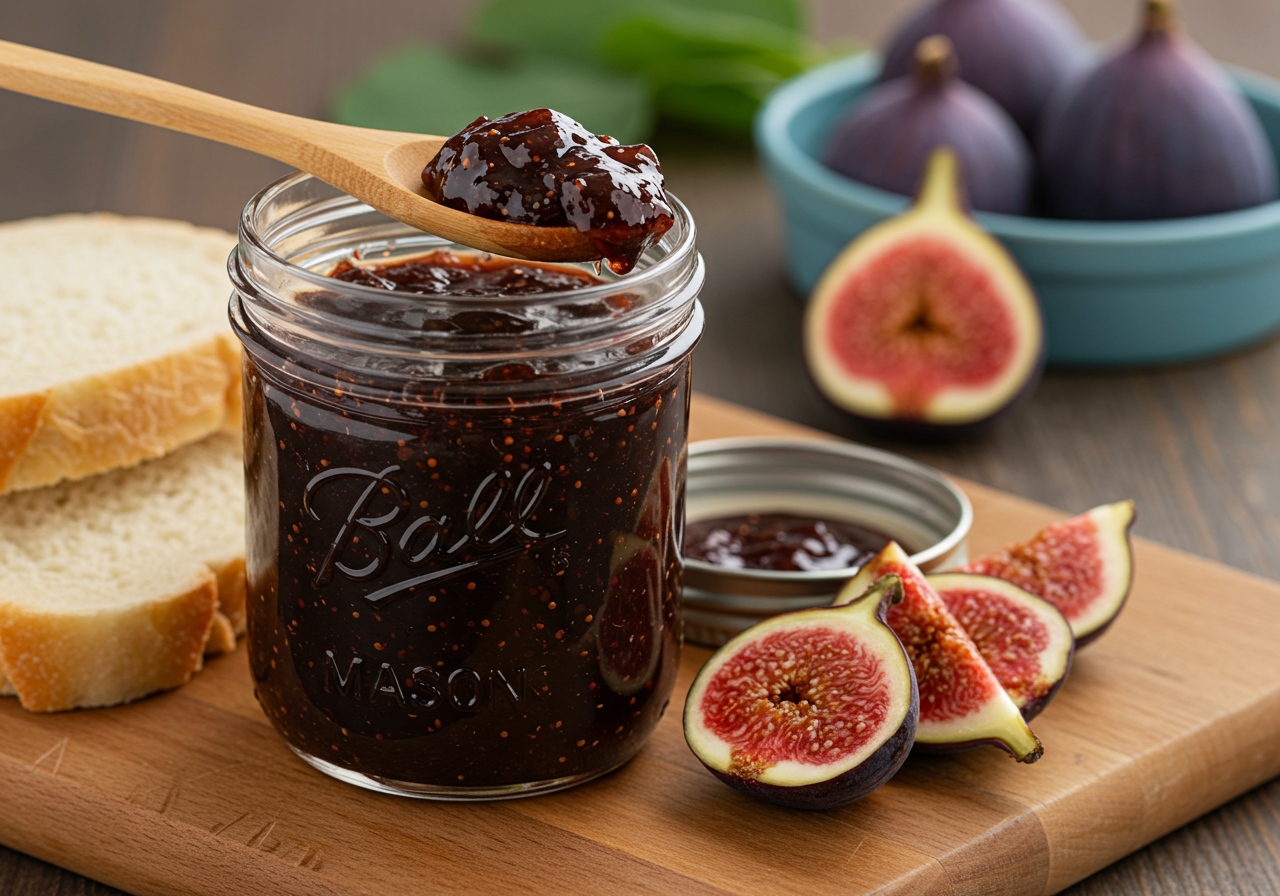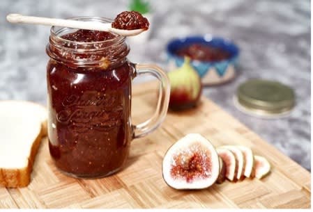 Start with around 5 lbs. of fresh figs. Chop them coarsely and add to a large, non-reactive saucepan (enamel or stainless steel). Add 6 cups of granulated white sugar, then toss to combine. Cover the figs and refrigerate for several hours: overnight, if possible. Put the pot over medium-low heat and slowly bring to a boil, stirring frequently. Raise the heat and cook briskly until the jam falls from your spool in a sheet. Add ¼ cup lemon juice and ½ teaspoon vanilla. Stir to combine for just another minute or so.